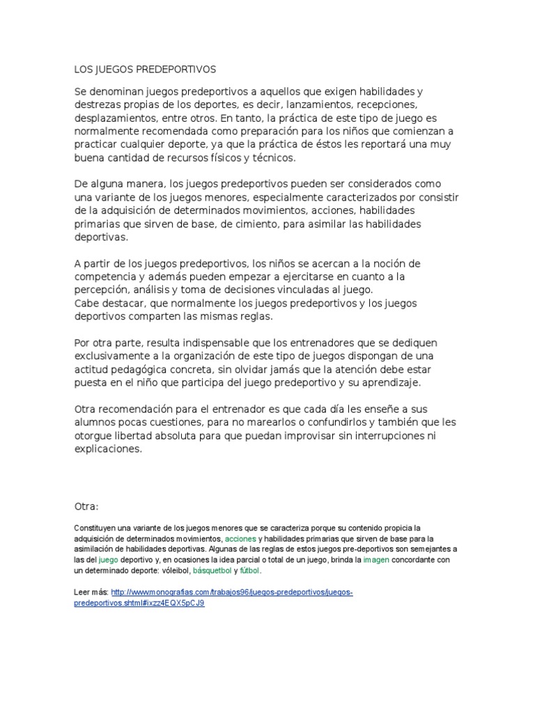 Es un juego con material reciclado que no requiere de muchas instrucciones para divertirse y pasarla bien. Los juegos predeportivos son aquellos que exigen que se tengan las habilidades y destrezas que tienen los deportivos, haciendo así que se pueda tener un mejor domino a la hora de practicarlos realmente. Juegos y actividades para bebés y niños. A continuación, os mostramos algunos de los juegos que realizamos en la sesión Los juegos predeportivos es la variación de un deporte con el otro, que requiere de destrezas y habilidades deportivas como proyección y recepción, desplazamiento, pase y drible, con la finalidad de ayudar en el desarrollo físico de habilidades, destrezas y para inculcar las reglas de un deporte.